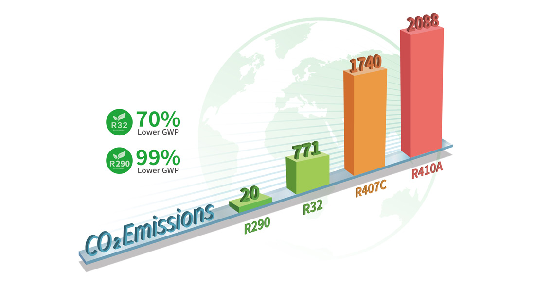 Compared to R410A, R32 refrigerant has a much smaller impact on global warming. In combination with EVITRON heat pump technology, it provides higher energy efficiency.