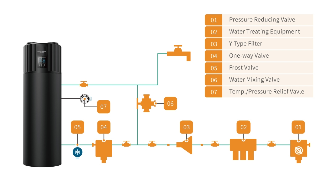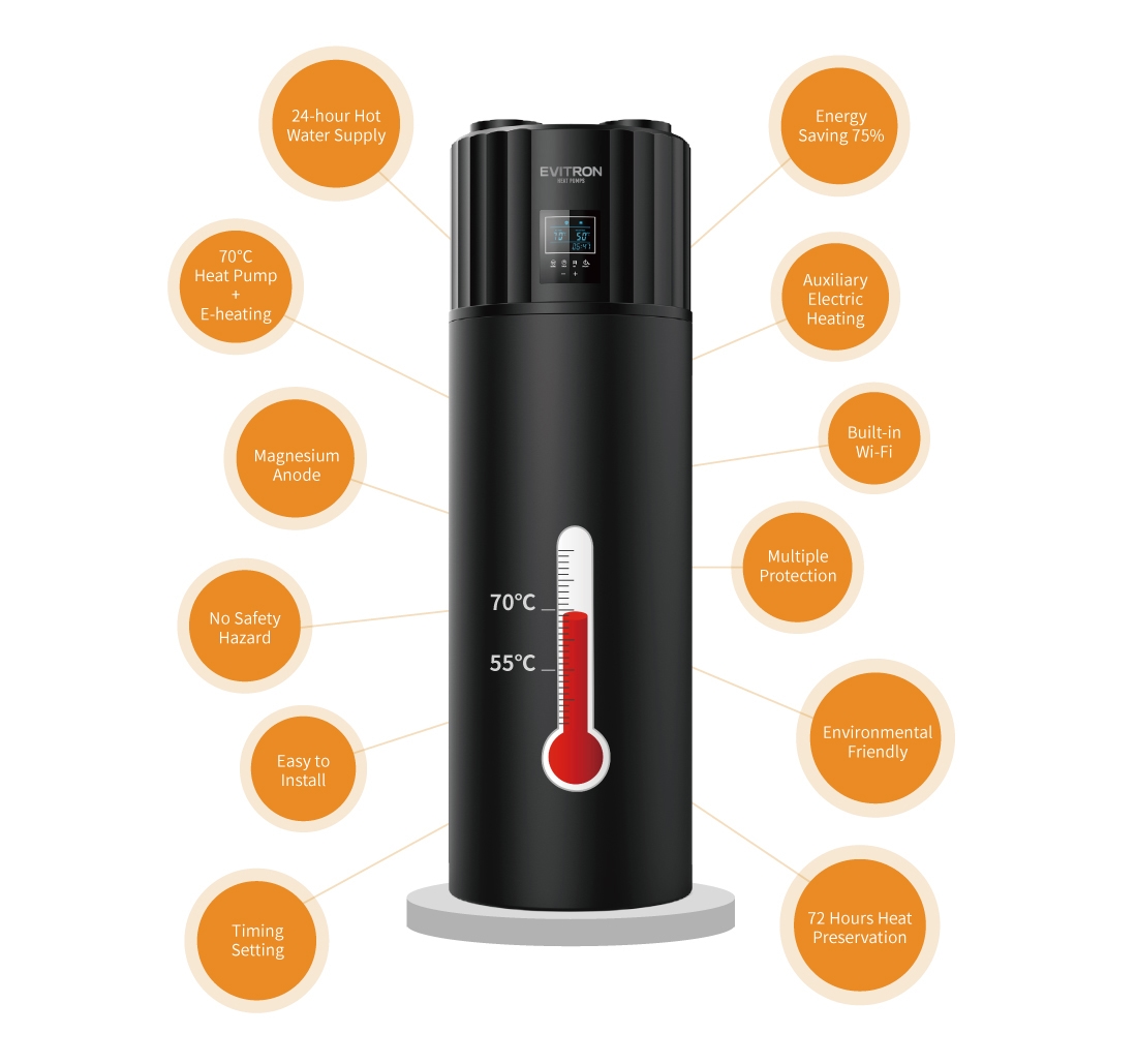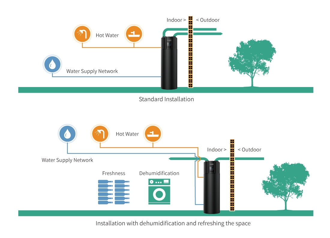 The Hotshot Series heat pump water heater is designed for domestic hot water. The cold air generated during heating can be used for dehumidification, especially in the humid season. It can also realize the combined utilization of electric energy and solar energy.
